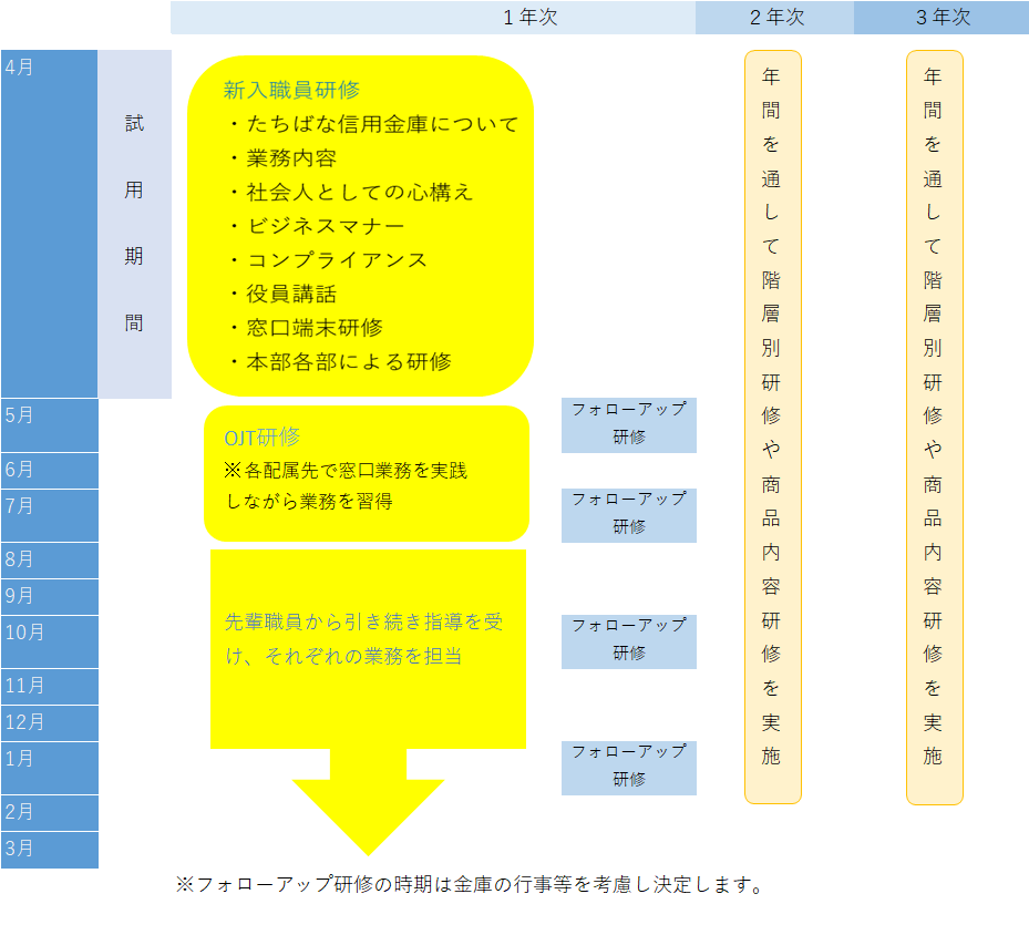 | 備考 | 2019年度に70周年の節目を迎えた当金庫の歴史は古く、各地域において長年のお取引を頂いているお客様も多くいらっしゃいます。既存のお客様への訪問・来店対応が多いので、なじみやすく安心感があります。 入庫後は先輩との同行訪問やOJTを中心に業務を覚えていけますので、先輩の背中を見ながらしっかりと学ぶことができます。金融に関してお客様の様々なニーズに応えていきますので、お客様への提案力も自然と身についていきます。 |